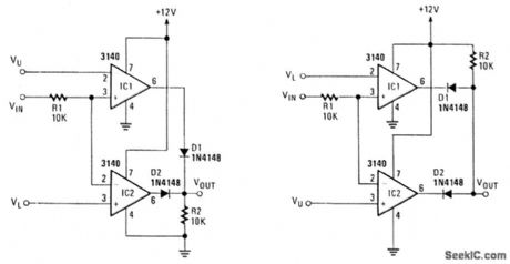 In Fig. 104-3(a), when YIN is between reference voltages VL and VU, output VOUT goes low. If VIN >VL IC2 produces a low. Because IC1 outputs low, if VIN>VU, both outputs are low and VOUT is low. If VIN<VL both IC1 and IC2 are low. Figure 104-3(b) operates the reverse of this; it produces a high when VL<VIN < VU.