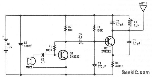 Transistor Q1 acts as an amplifier for condenser microphone MIC1. The output of Q1 is applied to the base of transistor Q2 through a 4.7- μF capacitor. C2 and L1 form an LC tank circuit, which is used to set the frequency at which the transmitter operates. Coil L1 is a variable inductor, centered a bit below 1 μH, that is used to adjust the modulating frequency of the circuit. Capacitors C1 and C2 are 4.7 pF units. A lower value can be used to raise the circuit's operating frequency. The microphone and Q1 provide a vary-ing voltage at the base of Q2, with the output of Q2 applied to the LC tank circuit. That causes a modulating action in the tank circuit that, when applied to the antenna, a short piece of wire 6- to 8-inches long, will provide a good, clear FM signal somewhere in the range of 88 to 95 MHz with a range of about 100 feet.