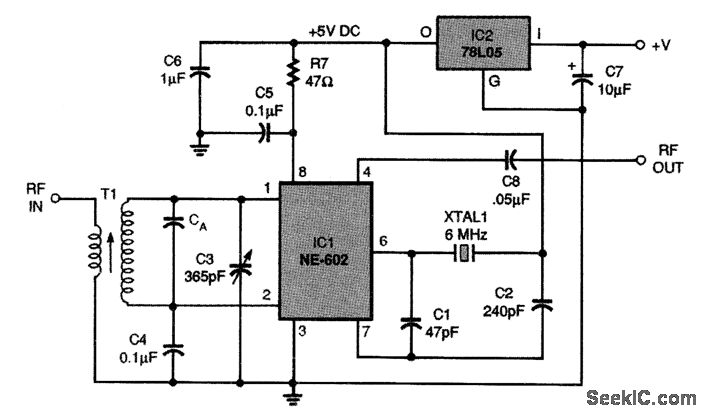 This circuit for an HP-band converter will convert the 10-MHz WWW signal to a frequency in the 75-m ham band. The local oscillator section of NE-602 is available on pins 6 (base) and 7 (emitter). In this circuit, a 6.00-MHz crystal oscillator is provided by the NE-602. Capacitors C1 and C2 form the feedback network. The junction of C2 and XTAL1 can be connected to either the 15-Vdc line or ground (the former is shown here). The difference frequency between WWV's 10 MHz and the 6.00-MHz crystal frequency is 4.00 MHz, which is located at the top end of the 75-m ham band. Crystals with other frequencies will produce other output sum or difference frequencies, so tune the receiver appropriately if something other than 6.00 MHz is used.