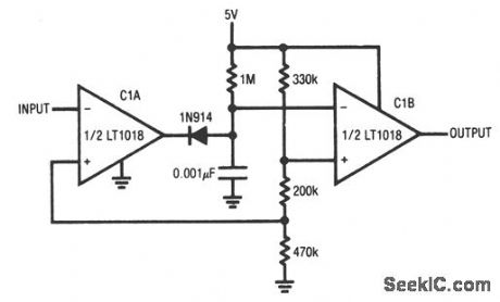 This circuit uses both sections of an LT1018 to prevent lock-up in processor-based systems. Such lock-up can occur if the system misses an instruction because of transients in hardware or software, and usually results in loss of pulses somewhere in the system. This circuit issues a reset command in response to such a pulse loss. Normally, a pulse train appears at the circuit input and causes the C1A output to pulse low. The diode path discharges the 0.01-μF capacitor each time the C1A output goes low. Interruption of the input pulse train (after the 7th vertical division) allows the capacitor to charge beyond the C1B threshold, and triggers C1B low. This pulse can be used to reset the system (applied to the microprocessor RST input). The C1B negative-input RC values can be adjusted to accommodate various input pulse-repetition rates. Linear Technology, Linear Applications Handbook, 1990, p. AN31-10.