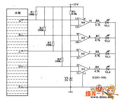 This water level indicator circuit is composed of the water level detection electrode A-E, the voltage stabilization diode VS, the resistors Rl-R9, the four op-amps Nl-N4 and the LED VLl-VM, as the figure shows.