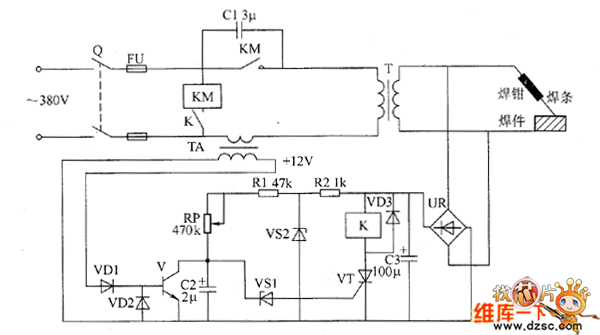 The welder no-load power saver circuit is composed of the detection circuit and power saving control circuit, and the circuit is shown as the chart. Detection circuit is composed of the current transformer TA, diodes VD1, YD2, transistor V, bridge rectifier UR, filter capacitor C3. Power saving control circuit consists of resistors R1, R2, capacitors C1, C2, voltage regulator diodes VS1, VS2, thyristor VT, diode VD3, relay K and AC contactor KM. R1, R2 select 1/2W metal film resistors. RP uses 2W organic solid potentiometer. C1 uses the CBB capacitor or oil capacitor with the voltage being 630V. VD1 ~ VD3 select 1N4007 silicon rectifier diodes. VS1 uses ZCW15 silicon voltage regulator diode.