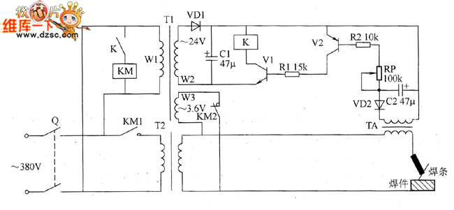 The welder no-load power saver circuit is composed of the knife switch Q, AC contactor KM, relay K, power transformer T1, welding transformer, transistors V1 and V2, resistors R1 and R2, capacitors C1 and C2, potentiometer RP, diodes VD1 and VD2 and current transformer TA, and the circuit is shown as the chart. In the circuit, T1, VD1 and C1 form the 24V DC power supply circuit; K, KM, R1, R2, RP, C2, VD2, and TA form the current detection and control circuit. R1 and R2 select 1/4W metal film resistors. RP uses solid organic or synthetic carbon film potentiometer; C1 and C2 select aluminium electrolytic capacitors with the voltage being 50V. VD1 and YD2 select lN4007 silicon rectifier diodes.