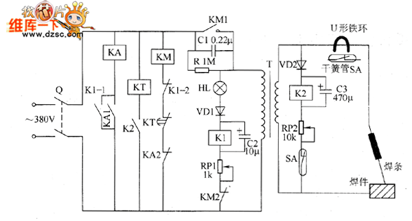 The welder no-load power saver circuit is composed of the knife switch Q, relays K1 and K2, relay KA, AC contactor KM, time relay KT, reed SA, diodes VD1 and VD2, LED HL, resistor R, capacitors C1 ~ C3, potentiometers RP1 and RP2 and the welding transformer T, and the circuit is shown as the chart. R uses 1/4W metal film resistor. RP1 and RP2 use 2W wire-wound resistors. C1 uses the CBB capacitor with the voltage being 630V; C2 uses the aluminium electrolytic capacitor with the voltage being 50V; C3 uses the aluminium electrolytic capacitor with the voltage being 16V. VD1 and VD2 use 1N4007 silicon rectifier diodes. KA uses the intermediate relay with the coil voltage selection 380V (or 220V) AC.