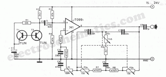 This wind sound effect generator circuit perfectly imitate the noise of the wind. Transistor T1 is connected as a Zener diode and will provide a noise signal to T2. The amplified signal by T2 is led to a frequency selective amplifier built with 741. With potentiometers P2a/P2b/P2c you can adjust the middle frequency of the filter and the wind sound. P1 adjusts the intensity of the sound which imitates the wind: an international scale Beaufort of wind intensity will make the adjustment easier.For P2 you may use a quadruple potentiometer of 15KΩ or 2 pots connected in parallel (P2c). If it is necessary the adjustment of the double T filter may be done for another value of P2. For that you need this formula:f = 1/2*pi*R*C with R=P2a=P2b=P2c and C=C5/2=C6=C7P2 may be simulated from many trimmer potentiometers (for vertical mounting of the plate).