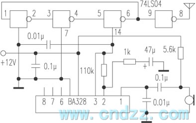 74LS04 is a TTL integrated circuit, there are six single-end input NAND gates. Three NAND gates can form an oscillator. When the power supply voltage is 5V, the oscillation frequency is approximately 90MHz; When supply voltage drops, frequency reduces; when supply voltage rises, frequency increases. Of course, the oscillation amplitude will also change, but has little effect. In this way, people can use the way bu changing the power supply voltage to adjust the frequency ( FM ). The specific approach is to use an audio amplifier IC BA328's output as its power supply. BA328 is a recording head amplifier.