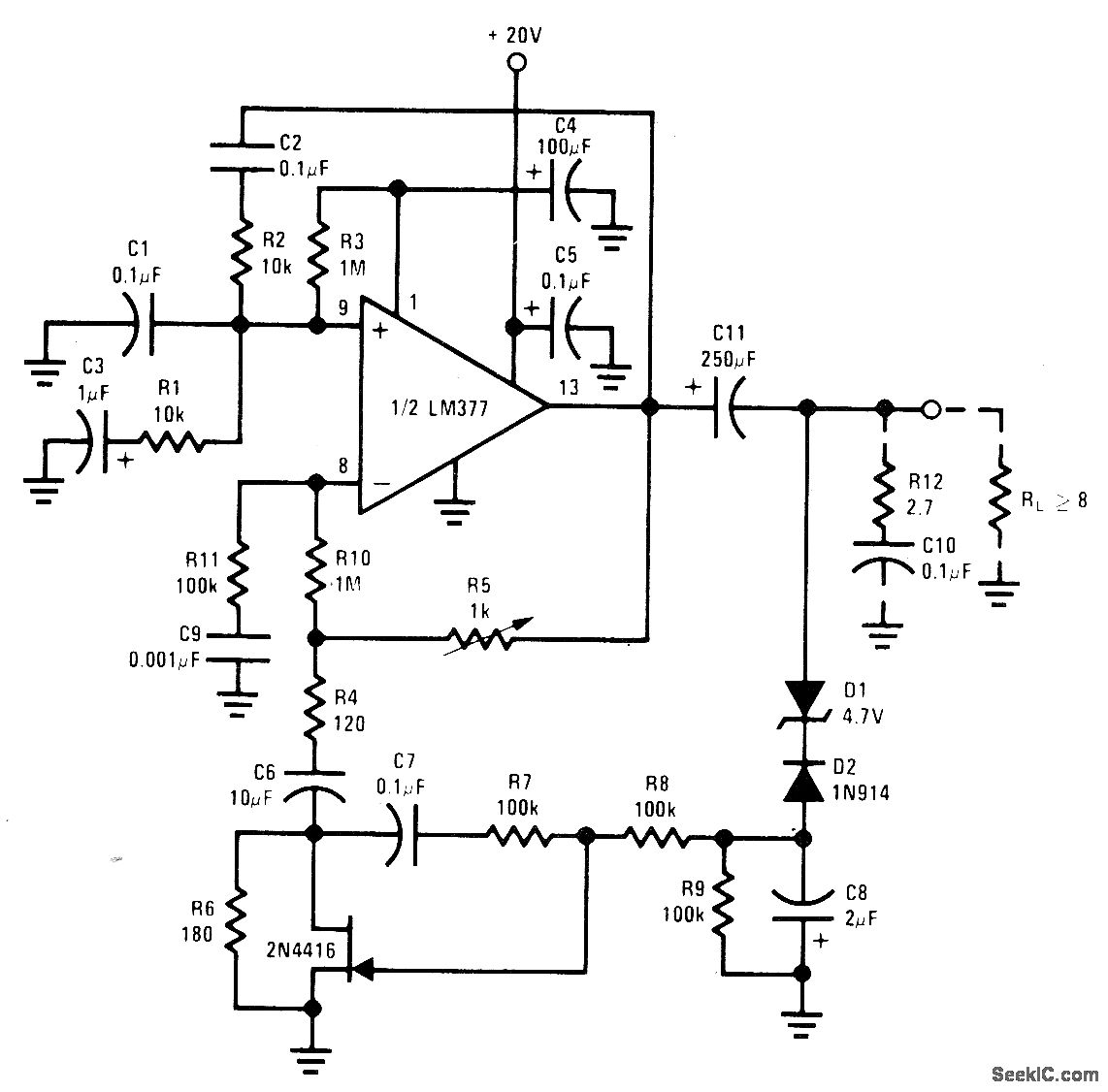 Uses haff of LM377 IC connected as oscillator, with FET amplitude stabiIization in negative feedback path. Total harmonic distortion is under 1% up to 10 kHz. With values shown, maximum output is 5.3 VRMS at 60 Hz. R12 and C10 are added if necessary to prevent high-frequency instability.- Audio Handbook, National Semiconductor. Santa Clara. CA. 1977. p 4.8-4-20.