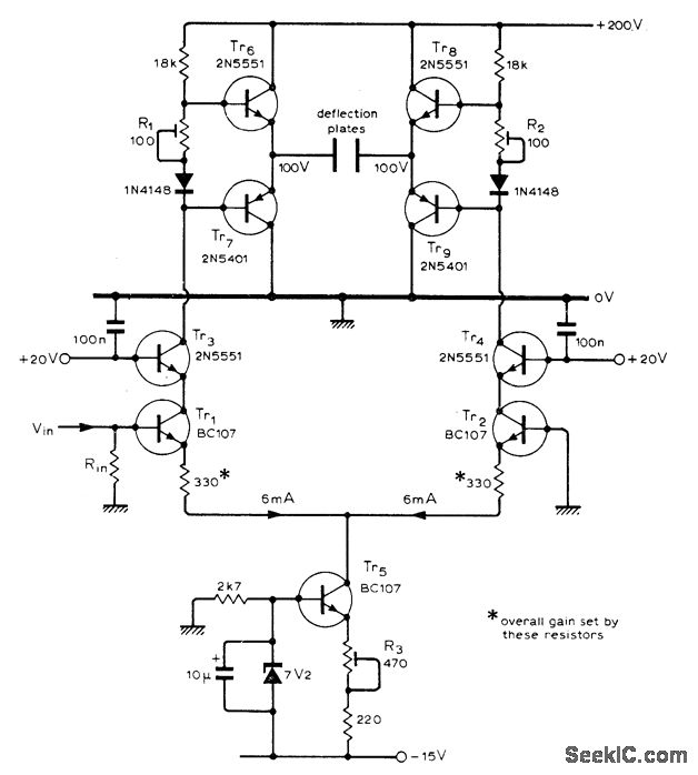 Rise time is 40 ns. Tr1-Tr4 form constant-current tail, with Tr5 improving linearity. Tr6 and Tr7 are complementary emitter-followers, as also are Tr8 and Tr9, for feeding deflection plates. Input should be from 50-ohm source to achieve full bandwidth. Other complementary small-signal transistors rated above 200 V can be used.-B.J. Frost, Wideband Y Amplifier for Oscilloscope, Wireless World, June 1976, p 71.