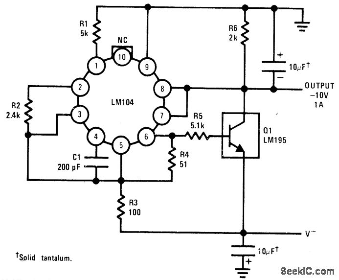 Combination of LM195 power transistor IC and standard LM104 regulator gives negative output voltage with full overload protection and better than 2-mV load regula tion Input voltage must be only 2 V greater than output voltage,-″Linear Applications,Voi,2 National Semico"ductor、Santa Clara、CA'1976、AN-110,p4-5