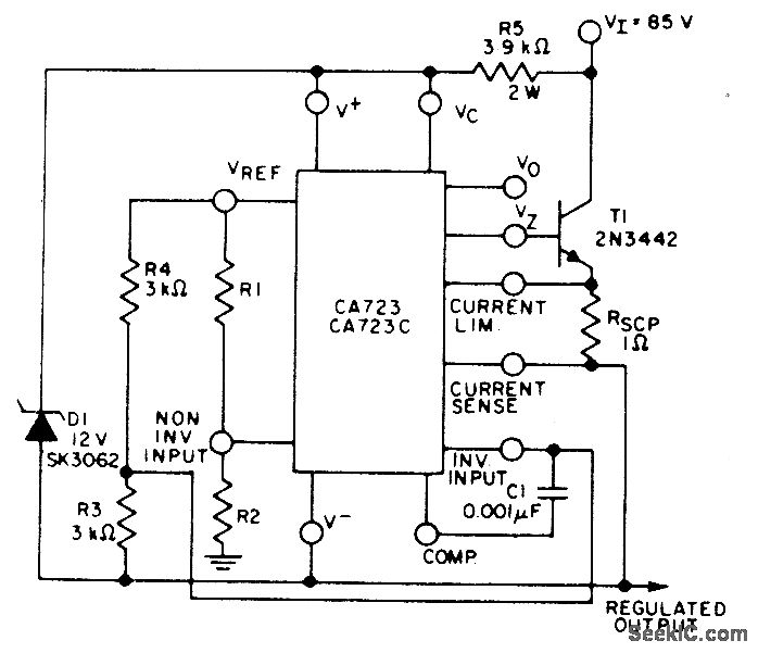 RCA CA723 regulator operating from 85-V supply delivers 50 V with Iine regulation of 15 mV for 20-V supply change and load regulation of 20 mV for 50-mA load current change.- Linear Integrated Circuits and M0S/ FET' s, RCA Solid State Division, Somerville, NJ, 1977, p 61.