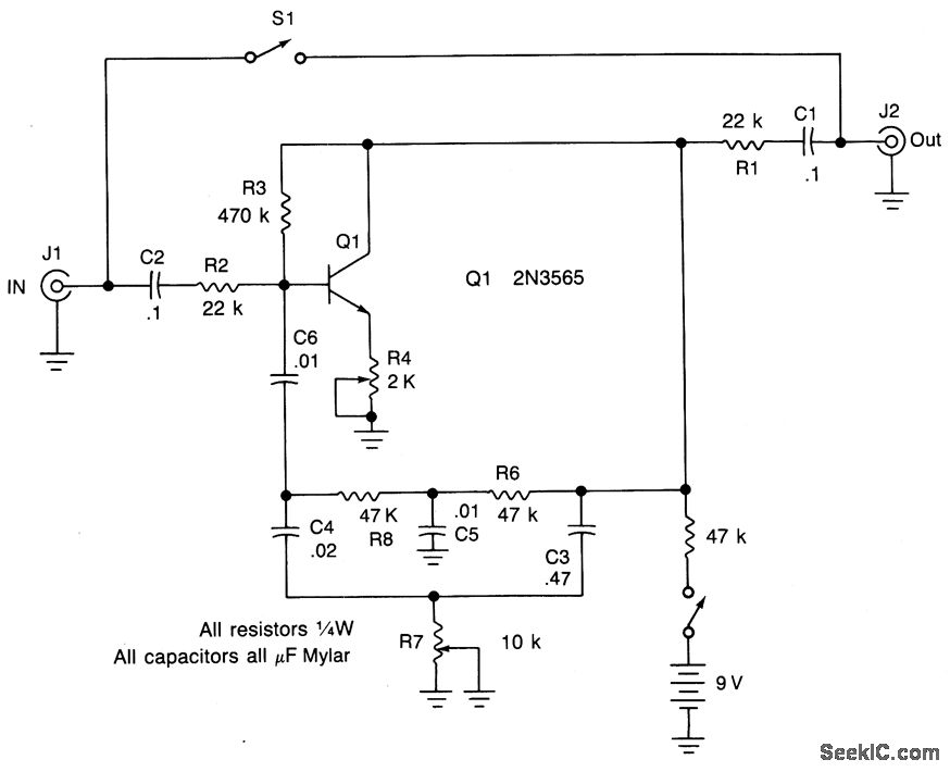Adjusting potentiometer R7 adds extra twang from way down low to way up high.To set the unit,adjust potentiometer R4 until you hear a whistle (oscillation); then back off R4 until the oscillation just ceases. The effect can be varied from bass to treble by R7.