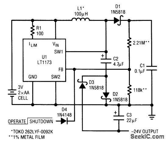 This circuit uses a Linear Technology LT1073 in a -24-V converter. The supply can be two AA cells (3 V) or 5 V. The circuit can deliver 7 mA.