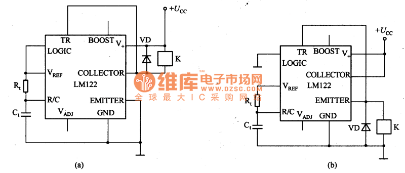 Figure 1 is the delay relay circuit composed by LM122. The LM122 is a timer integrated circuit from microsecond to hour level with a constant voltage circuit inside, so the timing is not effected by the change of the supply voltage, the output current is 50 mA and the working voltage is from 4.5 to 40 V.