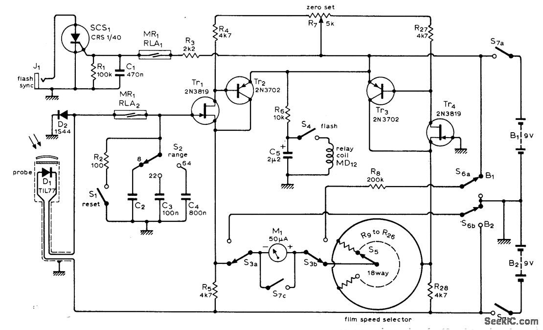Used to measure light produced at subject position by electronic flashlamps prior to actual taking of picture.Meter is calibrated to read correct f-number setting of lens aperture. Three ranges are provided,from f/2 to f/64, while film speed selector covers films from ASA 12 to 650.Texas Instruments TIL77 photodiode is used as sensing element in probe. Article covers construction, operation, and calibration of meter in detail. Tablein article gives values for 18 resistors (one for each film speed) selected by S5. Examples are 20K for ASA 64 and 51K for ASA 25.-R. Lewis, Photographic Flashmeter, Wireless World,Aug.1974,p273-278.