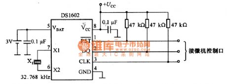 3 V battery and 32.768 kHz crystals Xl are added to DS1602 and it is connected to the microcomputer via the three thread and the circuit is very simple.32-bit counter can count for 136 years continously.Ac power is off , D51602 current consumption is less than 0.5 μA.And the battery life can be up to 10 years if 50 mAh capacity of the battery can be used.