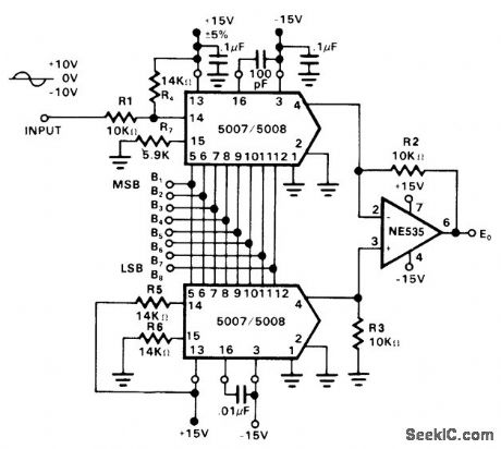 Combination of two Signetics 5007/5008 multiplying D/A converters and NE535 opamp gives digital control of attenuation and gain in audio system. AC input controls polarity of output, giving output of ±10 V for inputs from DC to 10 kHz and ±5 V if response goes up to 20 kHz.- Signetics Analog Data Manual, Signetics, Sunnyvale, CA, 1977, p 677-685. (View)