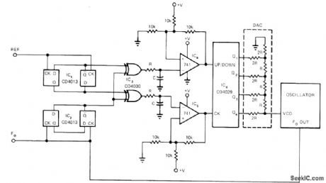 Combination of phase splitter and DAC provides accurate synchronization of high-stability VCO with external reference frequency. IC divides reference frequency by 4 and provides two signals 90° apart, while IC2 divides VC0 frequency similarly by 4. Phase relationship between outputs of IC3 depends on whether VCO is higher or lower than reference, while frequency of IC3 outputs depends on difference between oscillator and reference frequencies, Schmitt triggers IC4 and IC5 supply clock and up/down control to counter IC6. If VC0 frequency is low, IC6 counts up at rate proportional to frequency difference and delivers increasing control voltage to VCO as required for increasing oscillator frequency.-H. W. Cooper, Oscillator Synchronizer Is Fast Acting, EDN Magazine, July 20, 1973, p 83-84. (View)