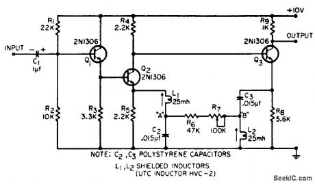 Provides stable multiplication over wide temperature range, as required for high-selectivity singlefrequency telemetry tone filter. Center frequency is 8 kc and bandwidth is 40 cps. Q is about 200.-W. New, Jr., Stable Q Mulliplier, EEE, 13:4, p 41. (View)