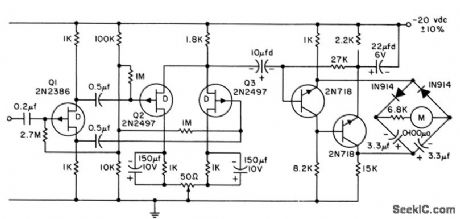 Used in noise investigation, analog computation, and measurement of power in complex wave-forms, where squarer of high accuracy and wide bandwidth is required. First stage is phase divider whose outputs drive squaring fet's Q2 and Q3 Output of squarer is coupled through capacitor to meter rectifier whose reading is Proportional to square of amplitude of input voltage.-L. J. Sevin, Jr., Field-Effect Transistors, McGraw-Hill, N.Y., 1965, p 83. (View)