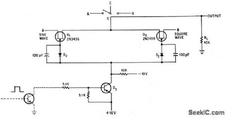 Circuit uses spdt configuration. Used to switch reference voltage (such as ground) to successive points on binary voltage ladder until comparator determines that output of ladder is equal to that of unknown voltage. Sine and square wave inputs at A and B produce output at C. Used also for low-level differential switching.-J. Gulbenk and T. F. Prosser, How Modules Make Complex Design Simple, Electronics, 37:32, p 50-54. (View)