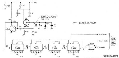 Stable and accurate clock is generated by high-precision 100-kHz crystal oscillator and decade divider ehain. Used in 20-meter receiver as part of digital display systemthat shows frequency of received signal aftercounting HFO,LO,and BFO outputs,summing counts, and displaying result.-M. A. Chapman, High Performance 20-Meter Receiver with Digital Frequency Readout, Ham Fladio, Nov 1977, p 56-65. (View)