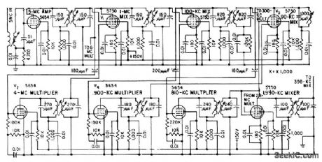 Crystol 5-Mc oscillator is monitored by natural resonance frequency of cesium (9,192.63184 Mc) to get primary frequency standard. Output signals are 100 kc and 1, 5, 10, and 100 Mc, with accuracy of one port in one billion. Starting with 5 Mc, 9,180 Mc is achieved as harmonic by direct multiplication. Remaining 12.631840 Mc is obtained from 5-Mc source by frequency muhiplication, division, and mixing. Circuit shows input section of synthesizer used for this purpose.-W.A. Mainberger, Primary Frequency Standard Using Resonant Cesium, Electronics, 31:45, p80-85. (View)