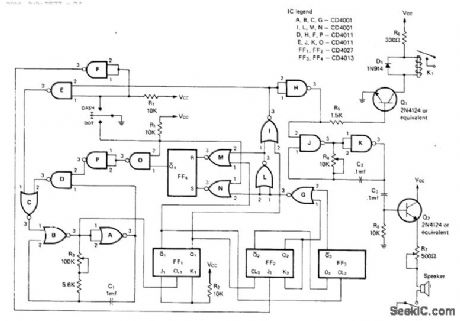 Includes sidetone oscillator and dash-dot memory along with variable speed, automatic spacing, and self-completing dots and dashes. If dot paddleis pressed and released while keyer is generating dash, dot is generated with correct spacing after dash is completed. Gates A, B, and C form gated MVBR.Gates D, E, O, and P serve to complete characters. JK flip-flops FF1 and FF2, D flip-flop FF3, and gates F, G, and L provide character-shaping required for dash-dot memory using gates M, N, and RS flip-flop FF4. Gates J and K generate audio sidetone. K1 is B & F Enterprises ERA21061 SPST reed relay. Supply can be 9-V battery.-T. R. Crawford, A Low-Power Cosmos Electronic Keyer in Two Versions, CQ, Nov.1975, p 17-24. (View)