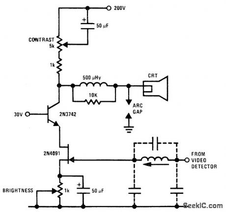 Cascode connection of 2N4091 JFET and 2N3742 bipolar transistor provide full video output for cathode. Gain is about 90. M-derived filter using stray capacitances and variable inductor blocks 4.5-MHz sound frequency from video amplifier. Cascode coAfiguration eliminates Miller capacitance problems of JFET, allowing direct drive from video detector.- FET Databook, Na-tional Semiconductor, Santa Clara, CA, 1977, p 6-26-6-36. (View)