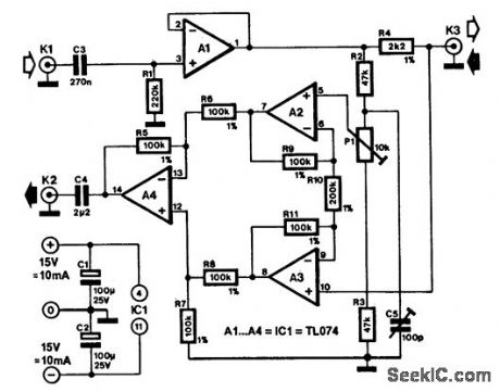 Duplex communication is, of course, not a new technique: it has been used, for instance, in telephone systems for many years. Those systems, however, use transformers to achieve duplex-this circuit does it with the aid of electronics.The principle is fairly simple. Two senders impose signals (U1 and U2, respectively) on to the audio cable. The voltage across the cable is then (U1+ U2)/2. The receivers at both sides of the cable deduct their side's sender signal from the cable signal: the result is that the signal is sent from the other end of the cable. This principle is the basis of the circuit shown. Notice that a similar circuit is required at either end of the link.Op amp A1 is connected as a buffer amplifier and serves as sender. The send signal is imposed on the cable via R4. Terminating the cable by R4 results in the voltage across the cable being only half the voltage output of A1. This does not detract from the operation of the circuit, however. At the same time, R4 ensures that signals emanating from the other end of the link cannot get to the output of A1; if they could, they would be short-cii-cuited by the output.The receiver is a differential amplifier consisting of op amps A2 through A4. The quality of the differential amplifier depends largely on the resistors used with the op amps; 1% types are, therefore, essential.The cable signal, (U1+ U2)/2, is applied to one input of the differential amplifier and the (halved) output signal of A1 to the other. Because the differential amplifier has a gain of 6 dB, the received signal applied to K2 has the same level as the original signal.The circuit is calibrated by connecting the cable to it and to its twin circuit, then injecting a 1-kHz sinusoidal signal and a 5-Vrms level to its input. The input bus of the other circuit must be short-circuited during the calibration. Adjust P2 for minimum signal at K2. Next, increase the frequency of the input signal to 10 kHz and adjust C5 for a minimum signal at K2. Repeat the procedure with the other circuit. The signal suppression at 1 kHz is of the order of 80 dB; at 20 kHz, it is approximately 60 dB.