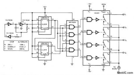 DG201 CMOS analog switch controlled by 50-kHz clock allows display of four input signals simultane-ously on singletrace oscilloscope, Adapter is used in chop mode for signals below 500 Hz. Frequencies above 500 Hz are best viewed in altemate mode with clock frequency of 200 Hz. One of inputs is used to trigger horizontal trace of CRO.- Analog Switches and Their Applications, Siliconix,Santa Clara,CA,1976,p7-63-7-66. (View)