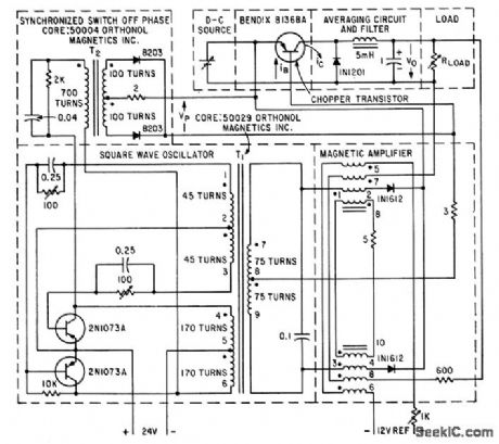 Chopper transistor supplies pulsewidth-modulated pulses to averaging circuit and filter. Filter output voltctge is compared to extemal reference voltage by magnetic am plifier, which changes pulse width to decrease devicttion. Chopper is driven by two-transistor square-wave oscillator modulated by mag-netic amplifier.-P. Bahhasctr, New Iransistor Regukttor Handles 500-Watt Outputs, Elec-tronics, 35:38, p48-49. (View)