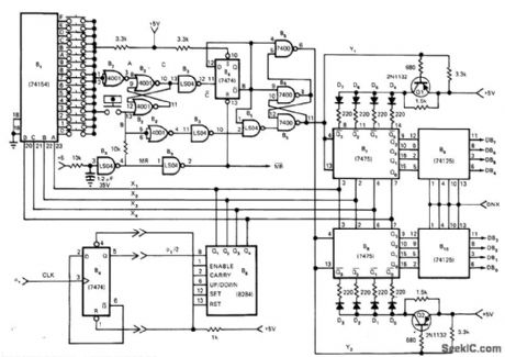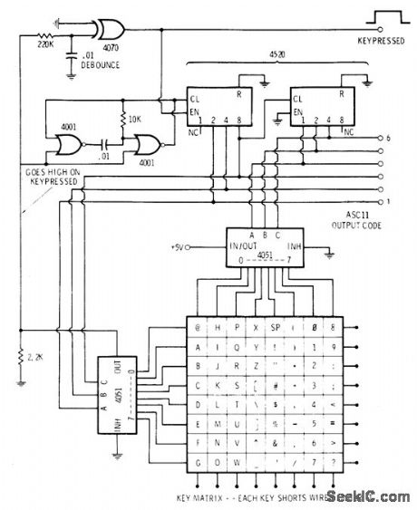 Converts key action into composite parallel ASCLL code. Circuit includes debouncing and two-key rollover. Two 4001 quad two-input NOR gate sections form 50-kHz clock that is gated. When clock is allowed to run, two cascaded 4520 binary counters are driven for continuous cycling through all their counts. Slower counter pro-duces 1-of-8 decoded output for 4051 1-of-8 switch. Faster counter drives second switch that monitors sequential rows of characters.When key is pressed, output from +5Vthrough both selectors stops gated oscillator and holds count. Resulting ASCll output is then routed to external output logic for control and shift operations. When key is released, scanning resumes and continues until new key is pressed.If second key is pressed before first is released, nothing happens until first key is released.Scanning then resumes and stops at second key location, to give two-key rollover permitting faster typing with minimum error.-D. Lancaster, CMOS Cookbook, Howard W. Sams, Indianapolis, IN, 1977, p 358-359. (View)