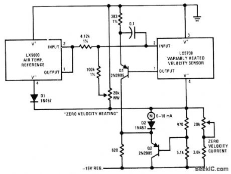 Low power consumption makes circuit attractive for battery-operated equipment. Uses National LX5600 temperature transducer covering -55℃ to +125℃, whose output is directly propor-tionalto absolutetemperature at l0 mV/K, Both zero and scale factor ale independently selectable. Thermometer is pulsed at low duty cycle to reduce power consumption, with sample and hold usedto obtain continuous output between pulses. Supply range is 8-12 V; 8.4-V mercury battery will give over 1 year of operational Iife. Output can be used to drive meter for direct readout. MVBR Q1-Q2 drives LX5600 through R9. C1 and R3 control OFF time, and C1, R1, R4, and R7 control ON time. Q3 issample transistor. Output is 0-50 μA for 50-100°F temperature change. Formulas in box give values for other ranges.-R. C. Dobkin, Micropower Thermometer, National Semiconductor, Santa Clara, CA, 1974, LB-27. (View)
