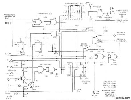 Complete CMOS logic cursorand update system is shownfor system using RAM memory,direct memory access, and writing during vertical intenral for displaying 512 characters per page on TV screen, Extemal 7.5-Hz source is required to make undedine cursorflash to indicate position at which next character will be entered on screen.-D, Lancaster, TV Typewriter Cookbook, Howard W .Sams,Indianapoils,IN,1976,p 128-129 (View)
