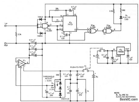 Oscilloscope measurements of ground noise can be unreliable because noise can enter your circuit via the scope's three-pronged power plug. You can avoid this problem by using the ground-noise tester shown. Powered by two 9-V batteries, the circuit dissipates power only while push-to-test switch S1 is depressed. Noise pulses that reach IC2A's switching threshold of about 1.5 to 1.8 V create a logic transition that triggers the monostable multivibrator IC3, which stretches the pulse to produce a visible blink from LED D1.You set the noise reference level by adjusting threshold-adjust potentiometer R1, which lets the circuit respond to minimum pulse amplitudes ranging from about 0 to 1 V. For convenience, you can use a one-turn potentiometer for R1 and calibrate the dial by applying an adjustable dc voltage, monitored by an accurate voltmeter. (View)