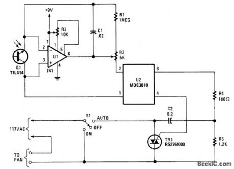 Q1 senses IR from heat sources, causes U1 to switch, activates optocopuler U1, and triggers TR1.This controls a fan. The Triac is from Radio Shack, or else a 200-V, 6-A unit (C106B) can be used. (View)