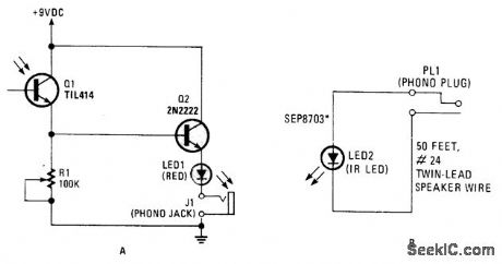 The visible light LED (LED1) in series with the IR unit (LED2) is used to indicate that the transmit-ted signal has been detected. The 100-kΩ trimmer potentiometer (R1) adjusts the repeater's sensitiity.The resistor that is usually found in series with the LEDs is omitted, because the voltage reading is about 1.0 Vdc as a result of the voltage drop across the lines. (View)