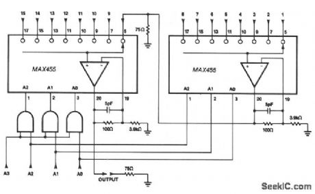 Two MAX455s can be cascaded to form a 1 of 15 video MUX by connecting the output of one MUX to one of the input channels of a second MUX. Although the two devices are usually close to one another, the output of the first MUX should be terminated to preserve its bandwidth. (View)