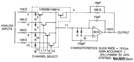 This circuit is used for analog signal selection or time division multiplexing. As shown, the feedback signal places the selected amplifier channel in a voltage follower (noninverting unity gain) configuration, and provides very high input impedance and low output impedance. The single package replaces four input buffer amplifiers, four analog switches with decoding, and one output buffer amplifier. For low-level input signals, gain can be added to one or more channels by connecting the (-) inputs to a voltage divider between output and ground. The bandwidth is approximately 8 MHz, and the output will slew from one level to another at about 15.0 V per μs.