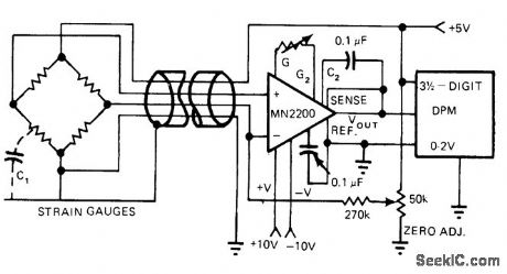 Micro Networks MN2200 instrumentation amplifier is used with strain gage to create digital-readout torque wrench.Strain gages having nominal impedance of 120 ohms are bonded to torque-sensing member at 450 to longitudinal axis, so gages in opposite bridge arms are under simultaneous tension or compression for given direction of torque.Bridge power is taken from 5-V digital panel meter supply. Instrumentation amplifier will work with any voltage from ±5 to ±15 V. Variable gain-adjust resistor G (l0-turn 50K pot) is set so DPM reads 200 ft-lb of torque at full scale in increments of 0.1 ft-lb.-R. Dulls, Instrumentation Amplifiers-They're Great Problem Solvers When Correctly Applied, EDN Magazine, Sept. 5, 1977, p 133-135. (View)