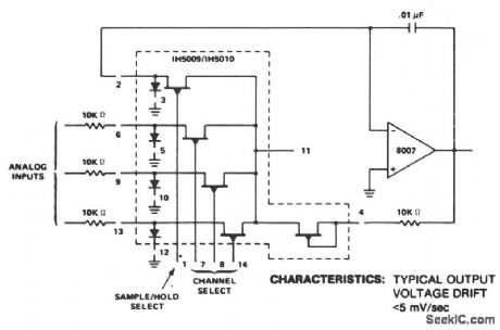 This circuit reconstructs and separates analog signals which have been time-division multiplexed. The conventional method, shown on the left, has several restrictions, particularly when a short dwell time and a long, accurate hold time is required. The capacitors must charge from a low-impedance source through the resistance and current-limiting characteristics of the multiplexer. When holding, the high-impedance lines are relatively long and subject to noise pickup and leakage. When FET input buffer amplifiers are used for low leakage applications, severe temperature offset errors are often introduced. (View)