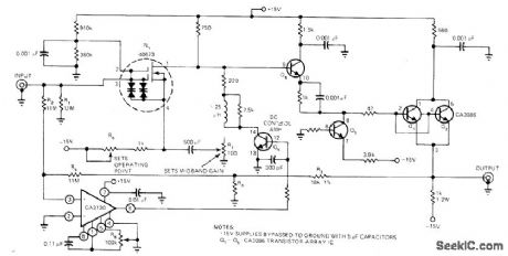 Wkleband amplifier handles inputs up to 100 mV P-P and drives 1-kilohm load, to meet requirements of oscilloscope preamps, instrumentation and pulsesignal amplifiers, and video signal processots. High-frequency gain is provided by 40673 dual-gate MOSFET. Low-frequency gain with DC stabilization is provided by CA3130 CMOS opamp. Transistors Q1-Q5 are part of CA3086 transistor-array IC. Values of R3 and R4 in feedback path establish amplifier gain. R6 sets operating point of N1 for 10-mA drain current. Base resistor ofQ3 is 1 kilohm.-H. A. Wittlinger, CMOS Op Amp, MOSFET Implement Wideband Amplifier, EDN Magazine, June 20, 1977, p 114. (View)