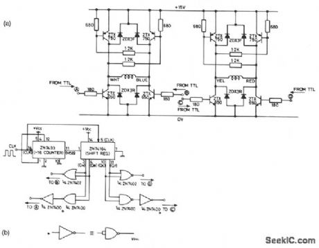 The circuit shown in Fig. 62-15A is designed to drive a 15-V, two-phase, bipolar stepping motor, providing a bidirectional single level voltage across each winding at currents of up to 9.6 A. The circuit consists of two identical transistor bridge stages employing complementary npn and pnp devices.The transistor conduction sequence is determined by external control logic, and the circuit will interface directly with standard TTL, suitable controllogic system is illustrated in Fig.62-15B.