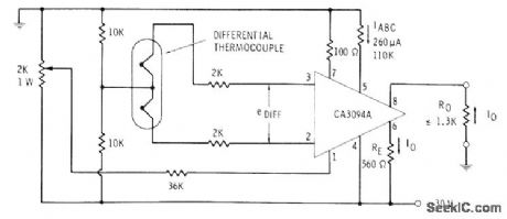 Amount of heat sensed by differential thermo-couple is proportional to voltage between pins 2 and a of CA3094A programmable power switch/amplifier. Input swing of ±26 mV gives single-ended output current range of ±8.35 mA.-E. M. Noll, Linear IC Principles, Experiments, and Projects, Howard VV. Sams, lndi-anapolis, IN, 1974, p 314.