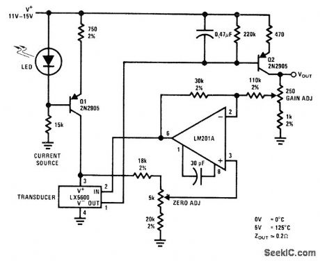 Output of National LX5600 temperature-sensing transducer is inverted, level-shifted, and given extra voltage gain of 4 to give required output of0 to +5 V for telemetry system or instrumentation recorder. Q1 furnishes constant current to thermometer, and Q2 provides inverting function. Resulting output signal is reinverted by LM201A opamp connected through zero-adjust divider to pin 3 which provides voltage reference.-P. Lefferts, A New Interfacing Concept; the Monolithic Temperature Transducer, National Semiconductor, Santa Clara, CA, 1975, AN-132, p 3. (View)