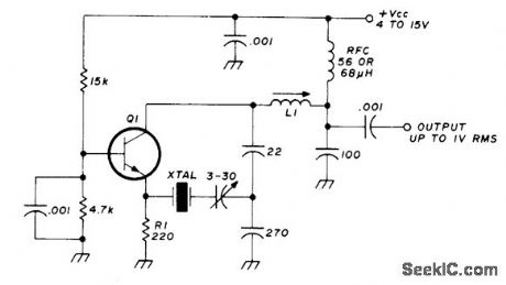 Crystal starting is reliable, and power dissipation of crystal is well below allowable maximum. Q1 is 2N918, 2N3564, 2N5770, BF180, or BF200. L1 resonates at crystal frequency with 22 pF (1μH for 15-30 MHz or 0.5μH for 30-65 MHz). Stability is as good as that of fundamental-frequency oscillator. Set L1 roughly to frequency with no supply voltage by shorting crystal and dipping L1 with grid-dip oscillator. Now apply power and tune L1 close to marked crystal frequency while monitoring output frequency. Remove short and trim to frequency with 3-30 pF trimmer.-R. Harrison, Survey of Crystal Oscillators, Ham Radio, March 1976, p 10-22. (View)