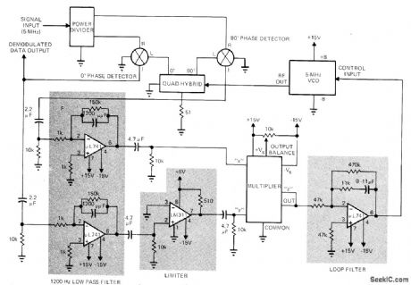 Differential phase-shift keyed double-sideband suppressed-carrier signal is demodulated by reinsertion of missing carrier, using synchronous or coherent detection. Receiver input signal is multiplexed by locally generated carrier, accurately controlled in frequency and phase. This is followed by low-pass filtering. Demodulation at output is by frequency/phase controlled loop that automatically locks local oscillator in frequency and phase to received vestige of carrier. This extracts phase information from modulated signal. Power divider is BF Associates H22, quad hybrid is Merrimac Research QHT-2, 0°and 90° phase detectors are Relcom M6A, and multiplier is Analog Devices 4281. Article covers theory and operation of circuit in detail.-R. Hennick, Demodulate DPSK Signals Coherently Using a Costas Phase-Lock Loop, EDN Magazine, July 1, 1972, p 44-47. (View)