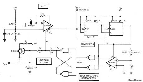Fast wide-band phase-locked loop uses one Am686latch-ing comparator as voltage-controlled oscillator, while other is coupled with TTL latch to produce edge-triggered comparator. VCO and comparator combined with low-pass filter R1-R2-C2 form PLL When locking fails, UJT causes VOUT to scan, repetitively sweeping all frequencies in VCO range until lock is restored,Capture and locking ranges are both equal at ±60% for 5 MHz input.-M. C. Hahn, PLL’s Capture Range Equals Its Locking Range, EDN Magazine, Sept. 20, 1977, p 117 and 119-120. (View)