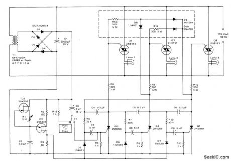 Uses simple ring counter in which triac gates form part of counter load. Incandescent lamps come on in sequence, with only one lamp normally on at a time. Pulse rate for switching lamp can be adjusted from about 1 every 0.1 s to 1 every 8 s.Circuit enclosed in dashed rectangle can be added to keep previous lamps on when next lamp is turned on. Only three stages are shown, but any number of additional stages can be added.- Circuit Applications for the Triac, Motorola, Phoenix, AZ, 1971, AN-466 p 11.