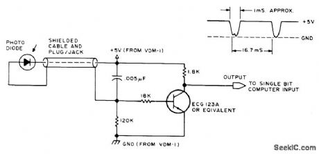 Any high-quality photodiode mounted in discarded housing of marking pen serves as pickup for holding against screen of video display. If diode is mounted in plastic lens, flatten end of lens with emery cloth to give narrower angle of acceptance. Developed for use with VDM-1 display terminal. Use CRO to monitor output as pen is moved across screen. Dark area on screen gives 5-VDC level, and white area gives dips. Article covers use in program design, editing memory dumps, and arranging complex displays.-J.Webster and J. Young, Add a $3 Light Pen to Your Video Display, BYTE, Feb, 1978, p 52, 54 56, and 58. (View)